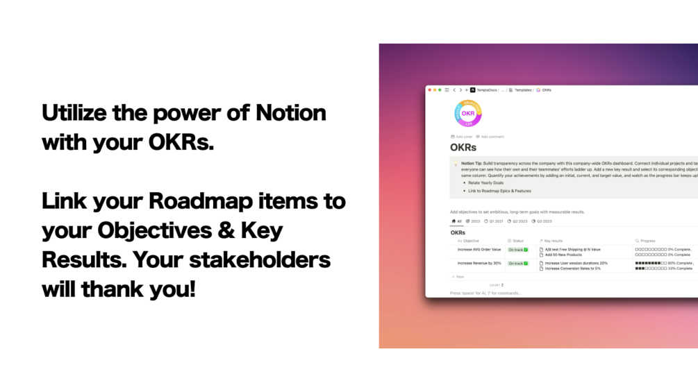 A FREE Notion Template with Code that creates progress on OKRs. You can also change your database relations to link them to your own.